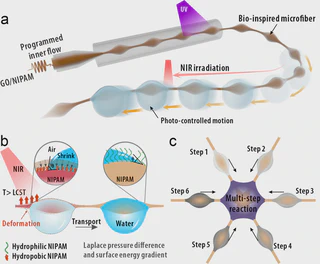 \[poly(NIPAM)\]components endow the fiber with nearinfrared (NIR) stimuli-responsiveness. Besides, its unique structure enables droplet pinning in the knots of the fiber. During NIR irradiation, the fiber can shrink and turn hydrophobic, which resulted in directional dropletmigration from one knot to another. Based on this phenomenon, controllable droplet merging could be initiated under light control, and chemical reactions could be carried out on-site. More intriguingly, systematic manipulation of droplet pathways was achieved through a woven fiber network, by which multi-step reactions couldoccur orderly. These features indicated that the bio-inspired photo-controllable spindle-knotted fibers would find vast opportunities in broad applications, such as micro-reactors and optofluidic systems.