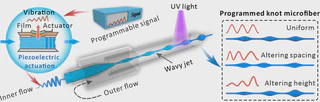 Microfibers have demonstrated significant application values in a large number of areas. Current efforts focus on developing new technologies toprepare microfibers with controllable morphological and structural features to enhance their functions. Here, a piezoelectric microfluidic platform ispresented for consecutive spinning of functional microfibers with programmable spindle-knots. In this platform, a jet of a pregel-solution flowing in thechannel can be subjected to a programmable piezoelectric signal and vibrates synchronously. Following a rapid polymerization of the wavy jet, microfiberswith corresponding morphologies can be generated, including uniform, gradient, and symmetrical knots. Such a unique knot structure contributes to awater-collection mechanism. Thus, it has been observed that microfibers with programmed knots enable even more flexible droplet handling and activewater transport. In addition, by constructing higher-order knot fiber networks, practical applications including spray reaction, lab-on-a-chip vapor detection,etc., can also be demonstrated. it is believed that this platform opens a new avenue for fiber spinning, and the programmable microfibers would be highlyapplicable in chemical, biomedical, and environmental areas.