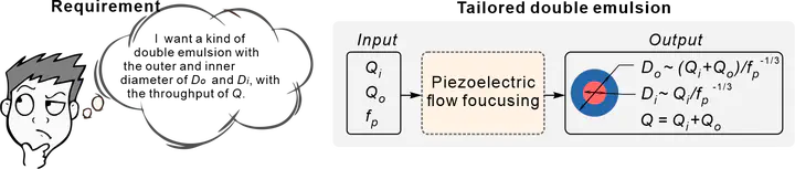 Photo by rawpixel on UnsplashUniform double-emulsion drops provide versatility in the membrane properties and microcapsule functions, which have advanced many natural sciences. However, the low throughput to the current microfluidics hinders their widespread use in further applications. Herein, we present a piezoelectric flow focusing (PFF) platform for rapid production of uniform double emulsions with tailorable sizes and morphologies. In this platform, the outer phase of the dispersed jet was subjected to a programmable piezoelectric signal and vibrated synchronously. Subsequently, the perturbation with specific frequency propagated along the jet surface and dominated the breakup processes. Finally, emulsion droplets with controllable size and morphology were then well achieved in controllable jetting regime with high throughput. More attractively, the platform enables preparing elaborate designs of more complex emulsions by easily modifying the channel topologies. We believe that this PFF platform opens an avenue for high-throughput generation of complex emulsions with controllable structures, and would be highly applicable in material science, energy applications, and environmental areas.