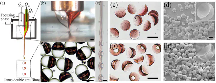 Schematic illustrationWe fabricate complex emulsions with irregular shapes in the microscale by a simple but effective multiplex coaxial flow focusing process. A multiphase cone-jet structure is steadily formed, and the compound liquid jet eventually breaks up into Janus microdroplets due to the perturbations propagating along the jet interfaces. The microdroplet shapes can be exclusively controlled by interfacial tensions of adjacent phases. Crescent-moon-shaped microparticles and microcapsules with designated structural characteristics are further produced under ultraviolet light of photopolymerization after removing one hemisphere of the Janus microdroplets. These complex emulsions have potential applications in bioscience, food, functional materials, and controlled drug delivery.